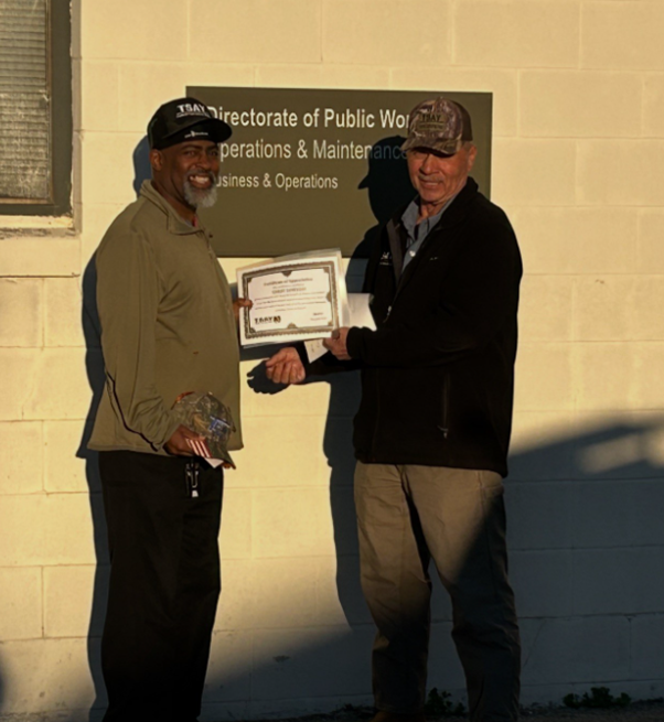 Hello everybody – we’re coming to you from Southeast Georgia at our Ft Stewart and Hunter Army Airfield (HAAF) base operations support locations in and around Savannah, Georgia. Tsay’s project manager Timmy Blount is seen here presenting some well-deserved recognition to Robert Kellar (HAAF Roads and Grounds lead) for his continued “service before self” work ethic and team building attitude. As per his certificate, Robert never complains, always goes above and beyond, and always completes the mission no matter what obstacles are in his way!